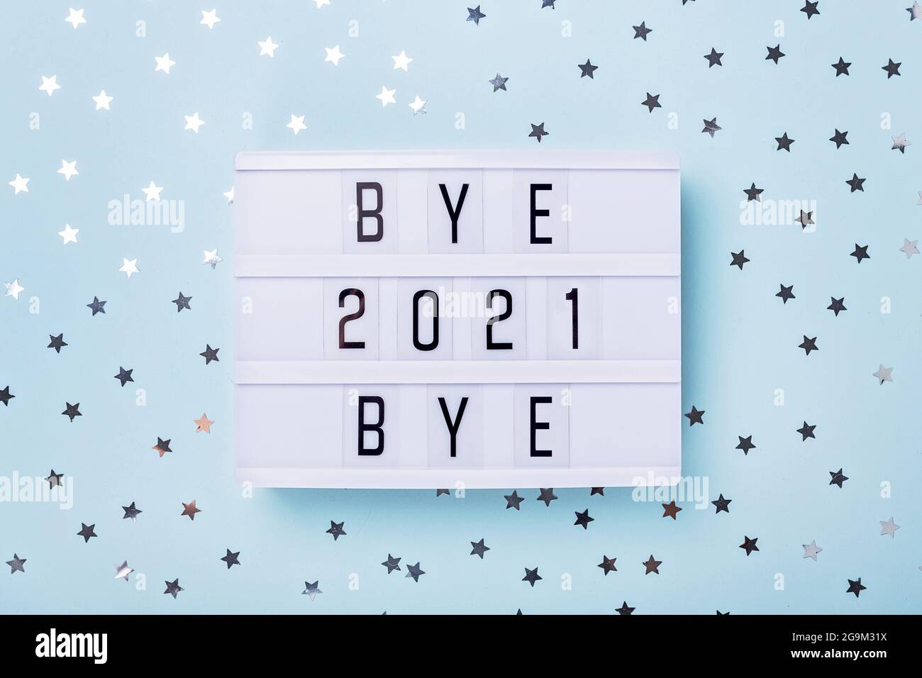Leuchtkasten Mit Text Bye Bye 2021 Auf Blauem Hintergrund Draufsicht Neujahr Happy New Year 2022 Concepts Image Stockfotografie Alamy